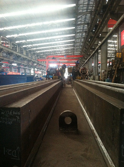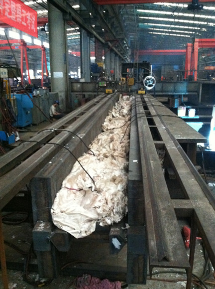 構件采用定位焊,焊前預熱溫度不低于120℃。焊接時(shí),嚴格控制焊接熱輸入,長(cháng)度方向上焊接方向一致,從中間向兩側對稱(chēng)施焊,使用氣體保護焊+埋弧焊進(jìn)行焊接,首先用氣保焊在35°方向打底,用埋弧焊填充2-3層;翻身清根,清根后在45°側用埋弧焊填充,把35°側產(chǎn)生的變形完全抵消(即板變平)為止;然后翻身把35°側再填充2-3層;再翻身填充45°側,把35°側產(chǎn)生的變形完全抵消(即板變平)為止;再翻身填充35°側,以此下去直到蓋面。整個(gè)焊接過(guò)程歷時(shí)7天,共計168個(gè)小時(shí)不間斷焊接施工。構件未發(fā)生變形,構件外形尺寸符合現行GB50205-2001《鋼結構工程施工質(zhì)量驗收規范》;UT、磁粉檢查合格率均達到100%。