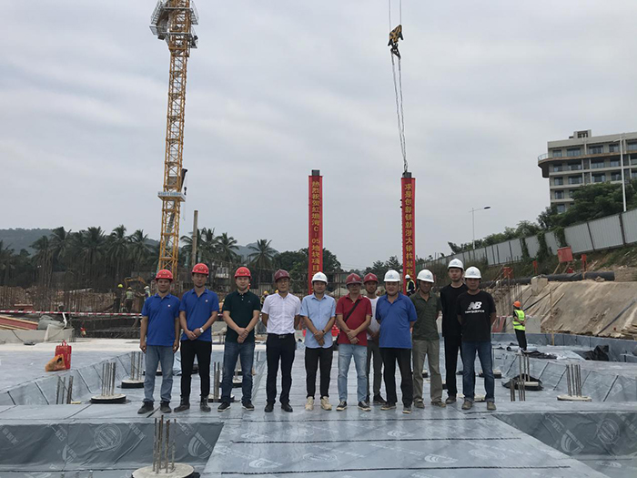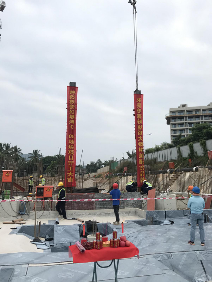 2020年11月3日上午9點(diǎn)18分。隨著(zhù)鞭炮聲的響起,在北京城建地產(chǎn)副總經(jīng)理劉向、北京雙圓監理總監陳寶棟、北京城建道橋集團項目經(jīng)理李行等人的共同見(jiàn)證下,由海南浙大鋼構有限公司承建的三亞紅塘灣旅游度假區C-05地塊項目一標段鋼結構工程首根鋼柱吊裝順利完成,三亞紅塘灣C-05鋼結構工程正式進(jìn)入施工階段。