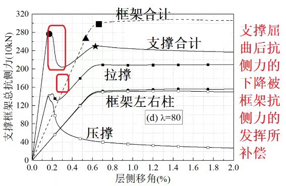 由圖3可見(jiàn),長(cháng)細比80、100時(shí),屈曲后承載力仍有少量下降,但隨側移增加、框架的抗側力繼續發(fā)揮而恢復。