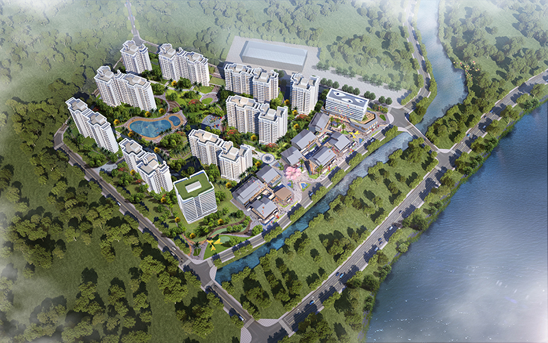 項目總建筑面積 147049.14 ㎡,其中地上計容建筑面積 105298.89 ㎡, 架空層、屋頂建筑面積 5007.3 ㎡,地下建筑面積 36742.95 ㎡。地塊西側包括 17 棟高層住宅建筑, 10~13 層,高度 40 米以下,住宅計容建筑面積 88534.06 ㎡,社區配套面積 970 ㎡;東側商業(yè)街北端為一棟商業(yè)樓,8 層,高度 28m,其余為兩層高的商業(yè)街,商業(yè)計容建筑面積 15794.83 ㎡。